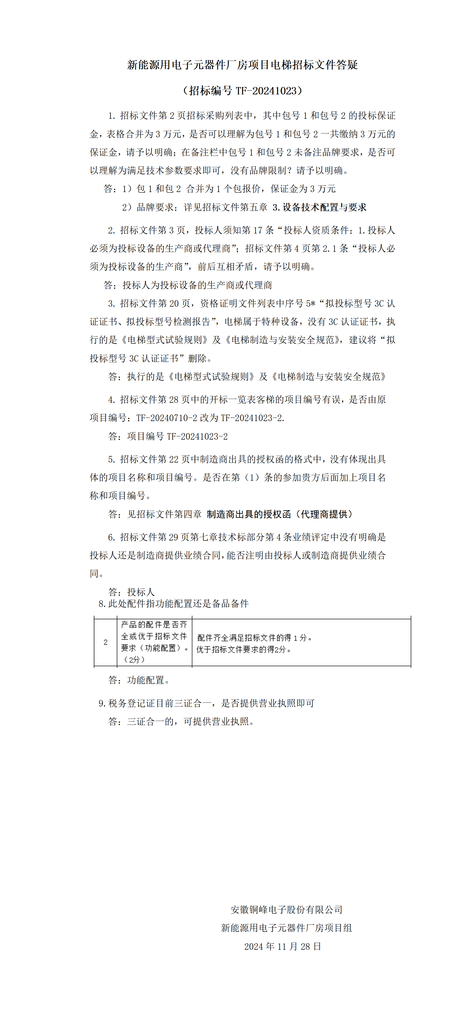 新能源用電子元器件廠房項目電梯招標文件答疑(招標編號TF-20241023)