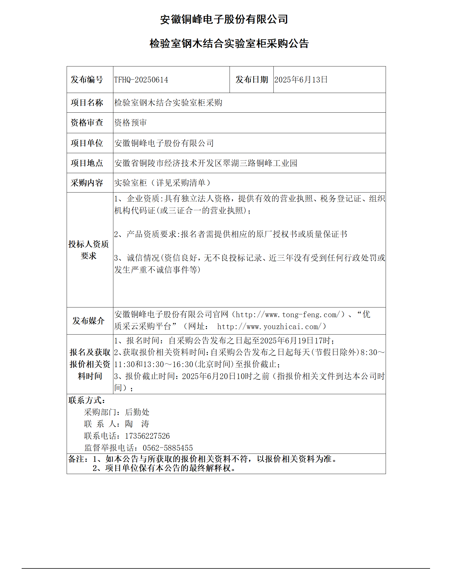 安徽銅峰電子股份有限公司 (檢驗室鋼木結合實驗室柜采購公告)_01