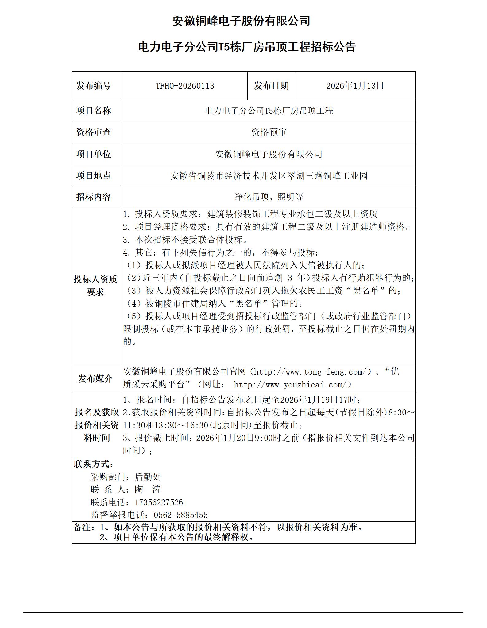 01安徽銅峰電子股份有限公司 (電力電子分公司T5棟廠房吊頂工程 招標(biāo)公告)_01