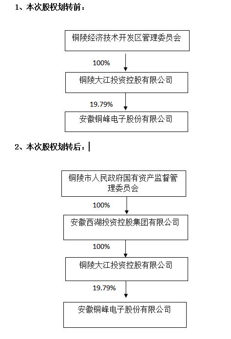 安徽銅峰電子股份有限公司(以下簡稱“本公司”或“公司”)于 2022 年9月16日收到控股股東銅陵大江投資控股有限公司(以下簡稱“大江投資”)的通知,為優(yōu)化國有資產(chǎn)配置,經(jīng)銅陵市人民政府批準,擬將公司實際控制人銅陵經(jīng)濟技術(shù)開發(fā)區(qū)管理委員會(以下簡稱“銅陵經(jīng)開區(qū)管委會”)持有的控股股東大江投資100%股權(quán)劃轉(zhuǎn)至安徽西湖投資控股集團有限公司(以下簡稱“西湖投資”)。2022 年 9月16日,銅陵經(jīng)開區(qū)管委會與西湖投資已就本次國有股權(quán)劃轉(zhuǎn)事項簽署了《關(guān)于銅陵大江投資控股有限公司之股權(quán)無償劃轉(zhuǎn)協(xié)議》。上述股權(quán)劃轉(zhuǎn)事項尚需辦理工商變更手續(xù)。